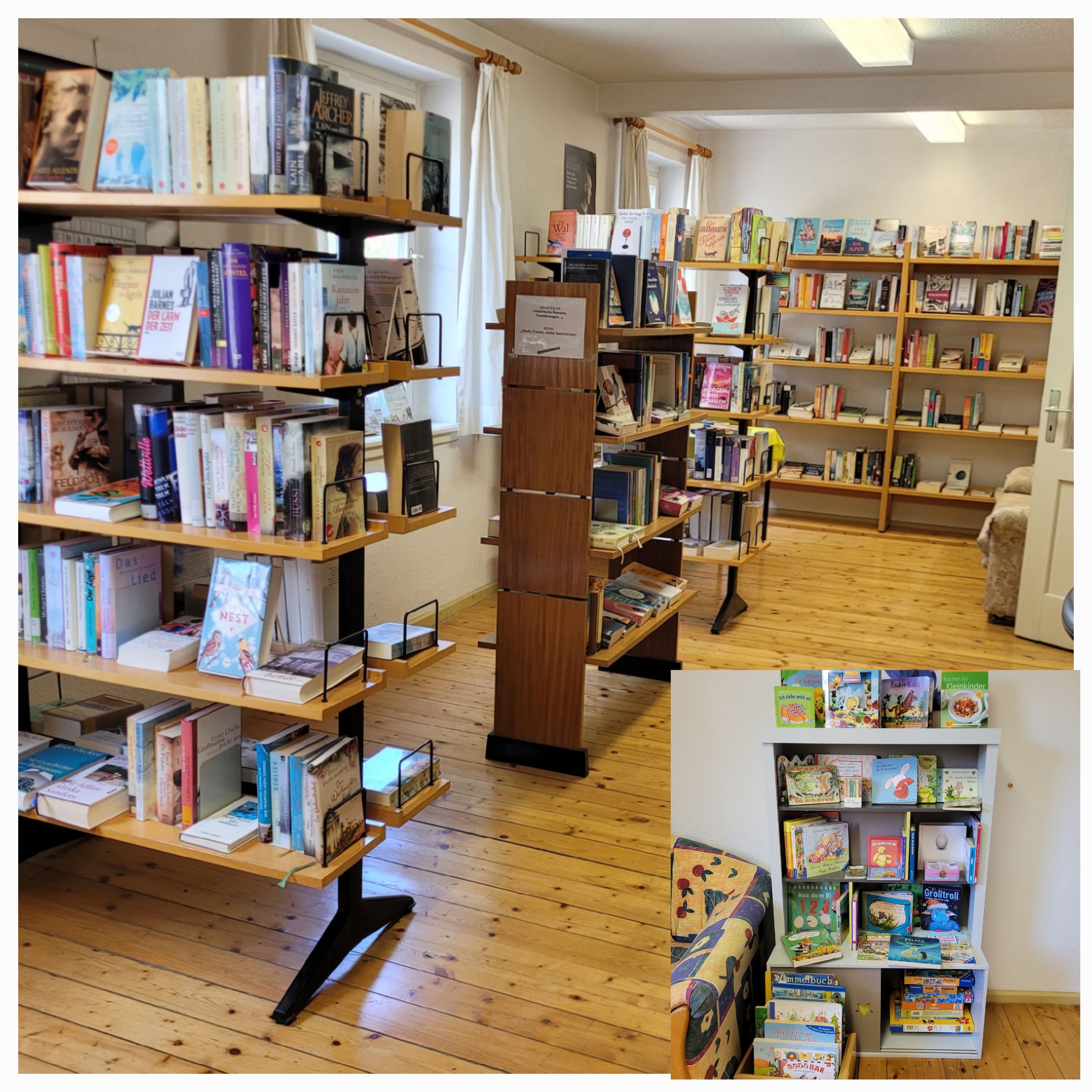 Das Sortiment (ca. 3.000 Medien) umfasst aktuelle Romane und Erzählungen, Krimis und Thriller, Ratgeber und Hörbücher. Kinder und Jugendliche haben ihren eigenen Raum, wo sie ungestört lesen und nach passenden Büchern stöbern können. Für die Jüngsten haben wir eine sehr große Auswahl an Bilder-, Vorlese- und Erstlesebücher. Für ältere Kinder haben wir natürlich ein altersgerechtes Angebot, auch an Sachbüchern.